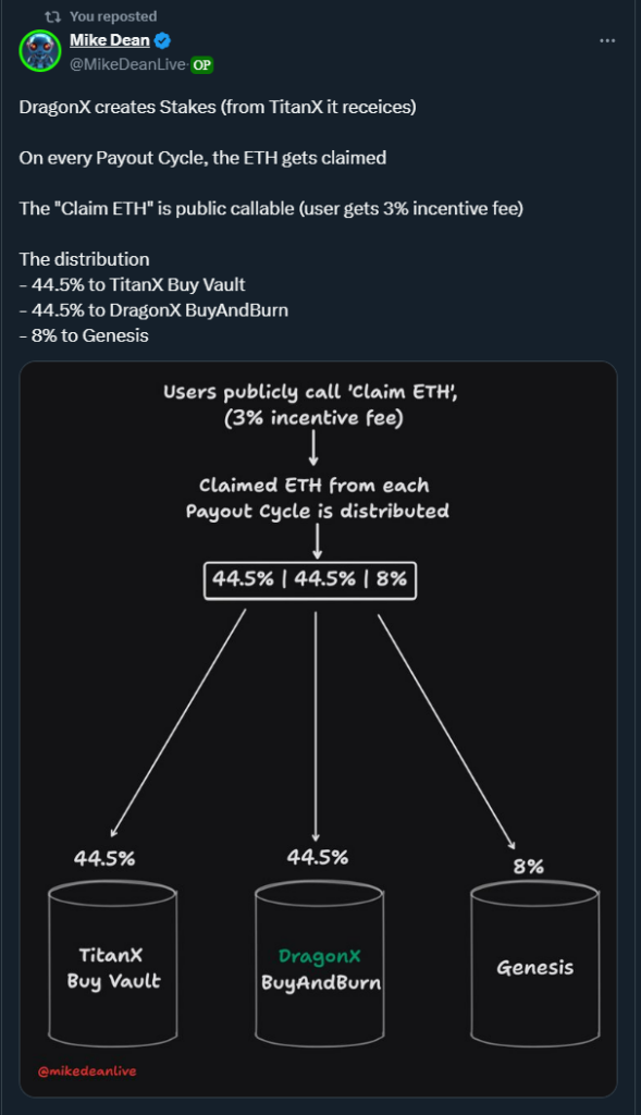 After each payout cycle, 92% of the ETH buys TitanX, 44.5% is restaked and 44.5% buys DragonX and burns it.