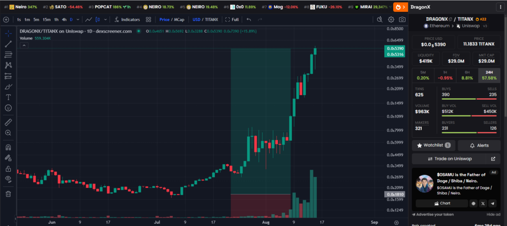 DragonX has seen an incredible run of more than 30x in 5 days, it’s the first token in this ecosystem to see such an incredible run.