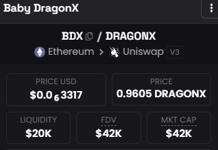 The current price of Baby DragonX (BDX) is sitting at 0.0(6)3317 or 0.9605 DragonX