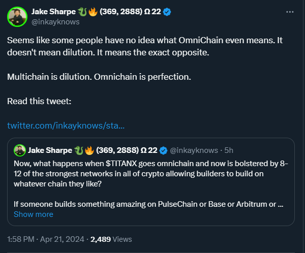 Livestream/Replay Today Agenda Join the TitanX Spaces (07 April 2024) on Twitter or YouTube TitanX Stats at 14 April 2024 TitanX Dune Dashboard https://app.titanx.win/stats TitanX Buy & Burn Stats Omnichain vs Multichain The focus is on developing TITANX as an omnichain platform. Unlike the multichain approach, which dilutes economic energy and fragments the community by...