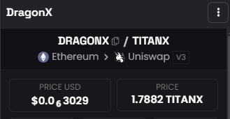 The current price of DragonX sitting at 0.0(6)3029 or 1.7882 to TitanX.