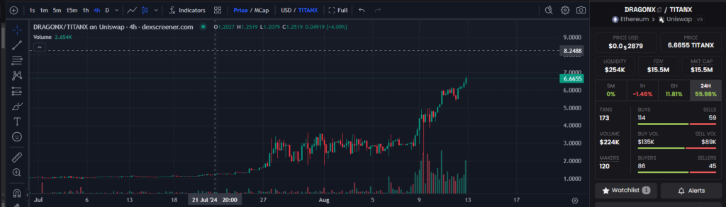 For instance, let’s take the example of DragonX, the scarce asset of the ecosystem with a limited supply built on top of TitanX. Its buy and burn vault swaps Eth for TitanX, swaps TitanX for DragonX and burns it which creates a double pump effect on $DRAGONX while making $Titanx pumping and scarcer.